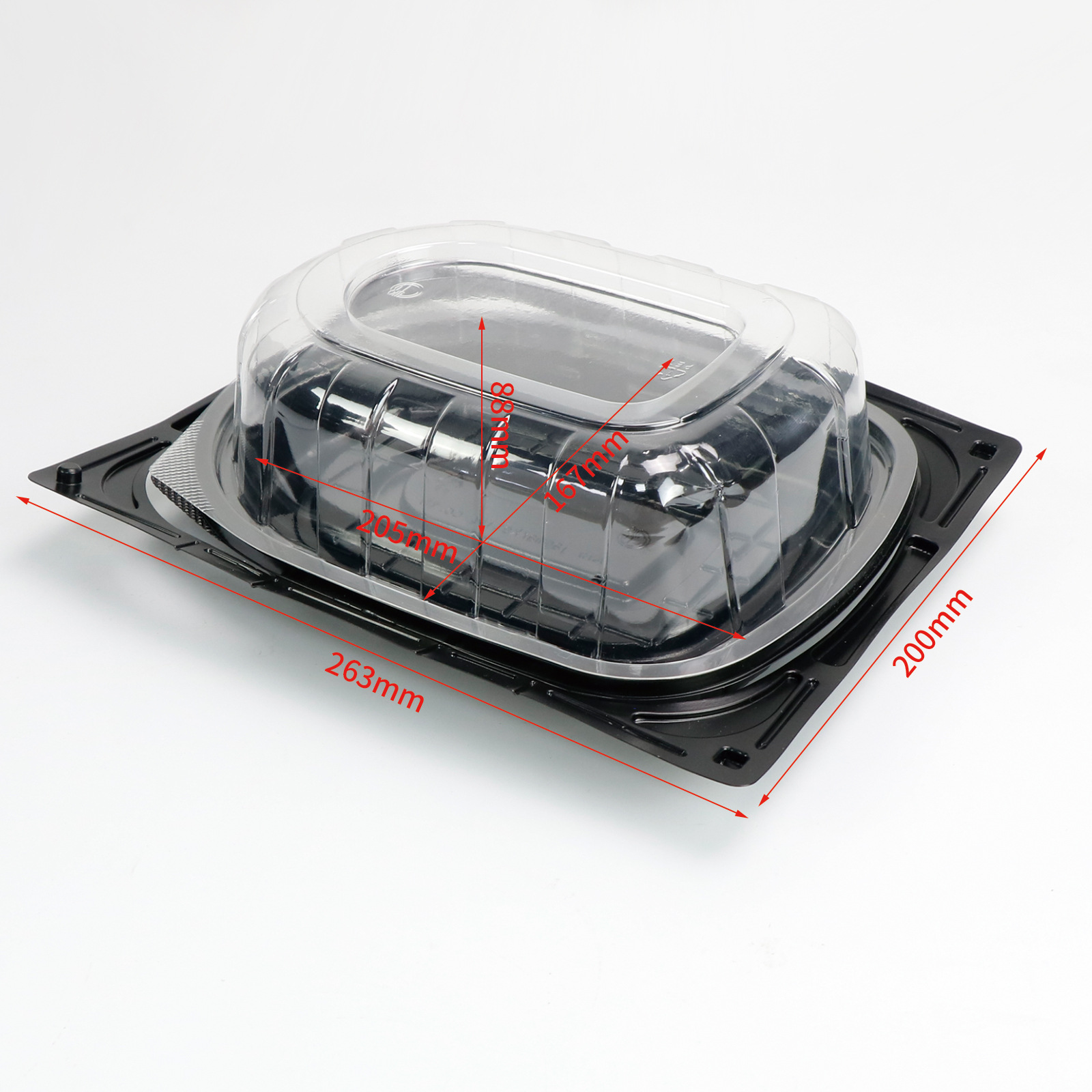 新款规格精准适配:尺寸 263×200×88mm,深度与容量适配单份 / 小份熟食(如半只烤鸭、一份龙虾、整只烤鸡切块等),盒型规整,便于堆叠存放,节省仓储与运输空间;